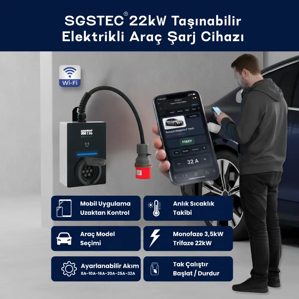 SGSTEC Flex 22kW Soketli Taşınabilir Elektrikli Araç Şarj Cihazı, yüksek güç kapasitesi, mobil kontrol özellikleri ve endüstriyel bağlantı avantajı ile profesyonel seviyede bir ev tipi AC şarj çözümüdür.