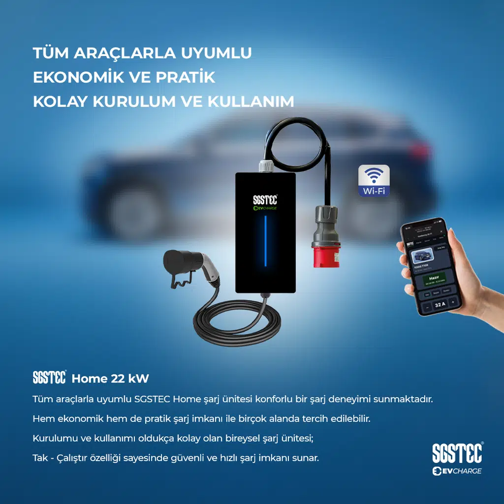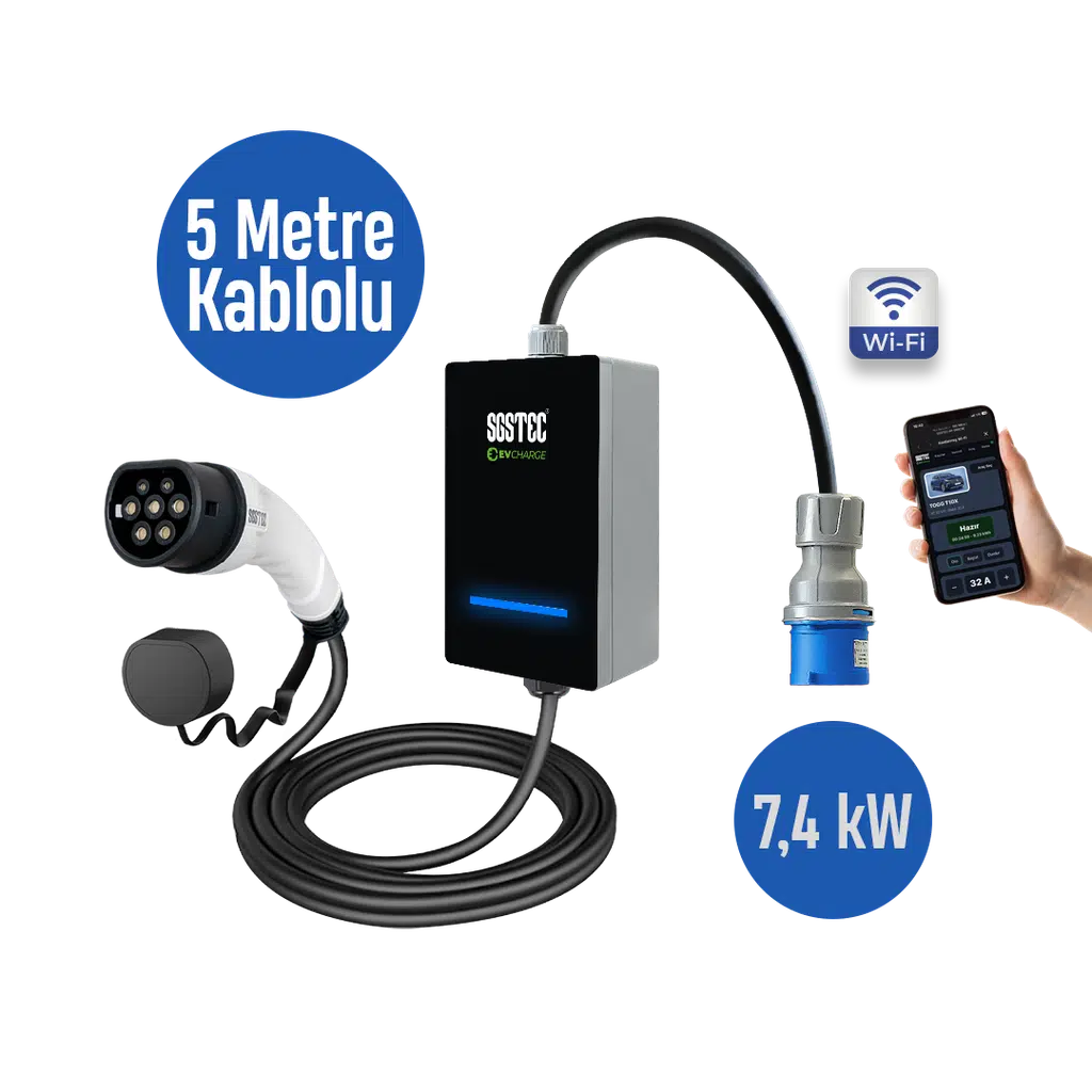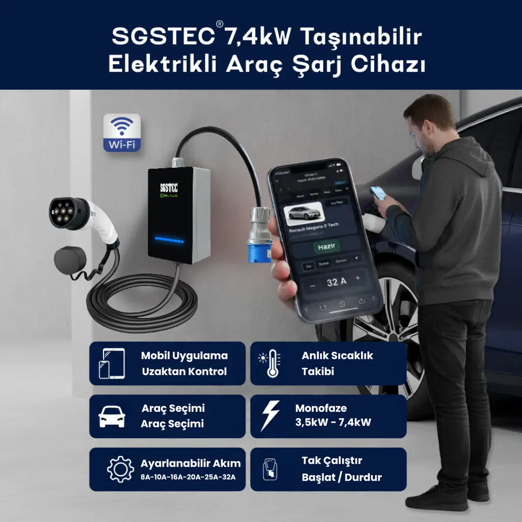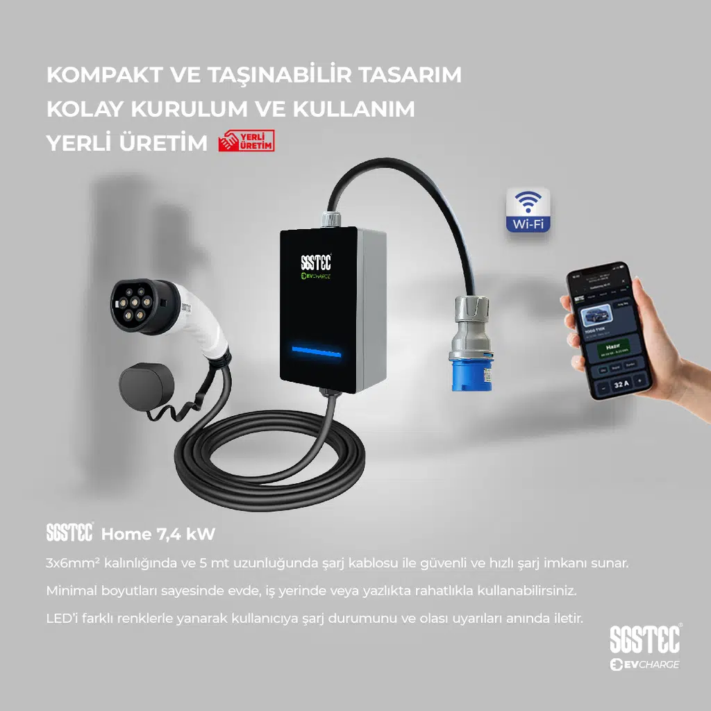 SGSTEC Home 7,4kW 5 Metre Kablolu Taşınabilir Elektrikli Araç Şarj Cihazı, monofaze yüksek güç kapasitesi, mobil kontrol özellikleri ve endüstriyel bağlantı avantajı ile profesyonel seviyede monofaze bir ev tipi AC şarj çözümüdür.
