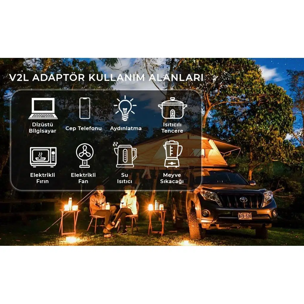 Elektrikli araçlarınız için geliştirilmiş olan V2L adaptörü, araçtan enerji çekerek günlük ihtiyaçlarınıza pratik bir çözüm sunar.